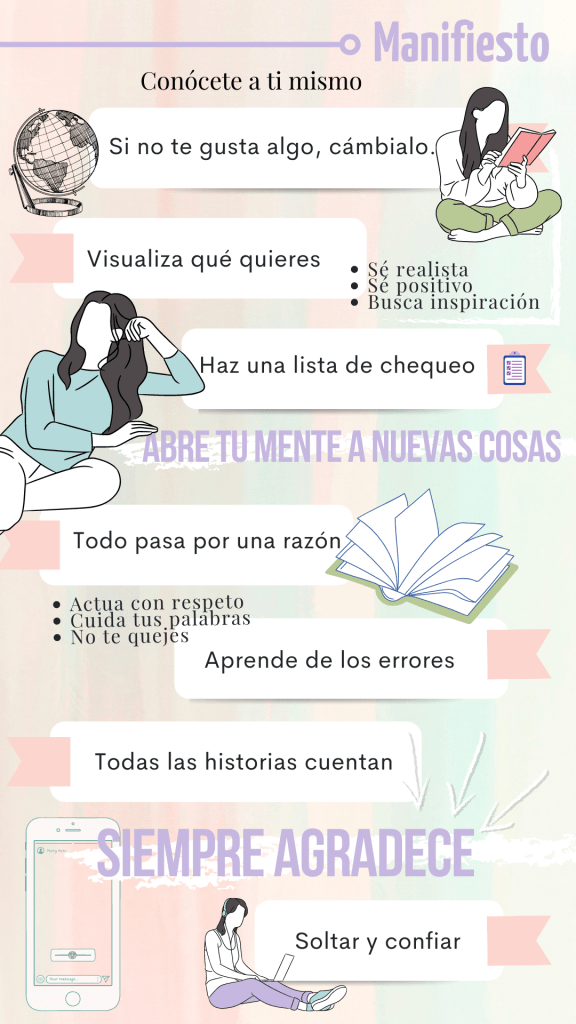 Este manifiesto reúne muchas de las frases que me he repetido varias veces y las estrategias que he utilizado para afrontar la vida. Frases que representan los cambios y los ajustes que he realizado para convertirme en la persona que soy ahora y cuando lo olvido o no sé qué hacer, vuelvo a leer cada una de ellas para recordar el camino y avanzar, en especial estas cinco que me recuerdan los pasos que he dado.