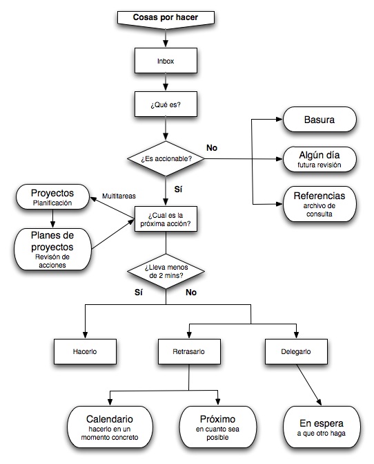 «Mantén todo fuera de tu cabeza. Decide qué acciones requieren tus tareas cuando aparecen — no cuando expiran. Organiza recordatorios de tus proyectos y sus acciones próximas.»