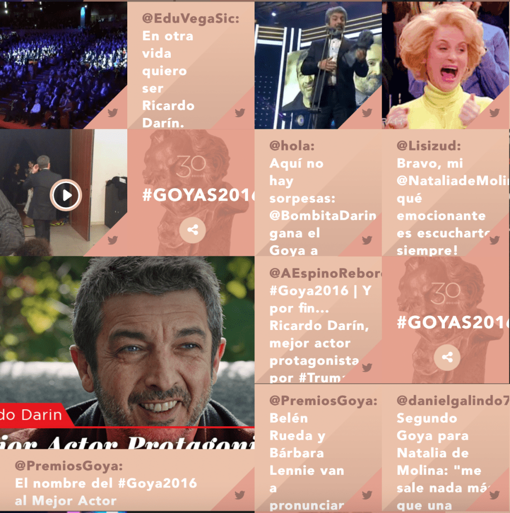 En el Radar encontramos todas las menciones, fotos, videos e imagenes que se compartieron durante los Goya 2016: Diferentes formatos, diferentes contenidos y diferentes plataformas pero una misma historia.
