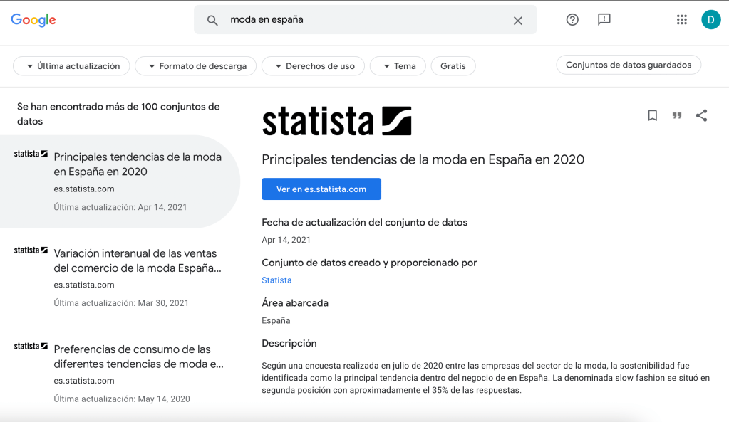 El uso de diferentes datos como las principales tendencias de la moda en España en el 2020 sacadas de datasearch de google en un proyecto de moda como @telardemoda nos permitirá ofrecer una experiencia mas real con el contenido, integrando estadísticas e información comprobable que al final le da credibilidad al proyecto.