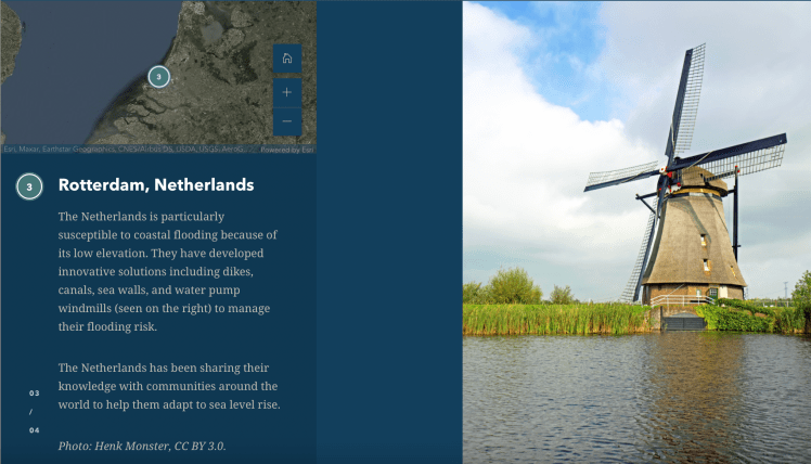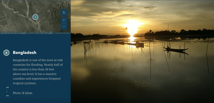 La aplicación Storymaps creada por el grupo ArcGIS permite crear una secuencia narrada de los hechos, en este caso se quiso contar las inundaciones que han habido durante años, ubicando a la audiencia y contextualizando el momento con mapa e imágenes.